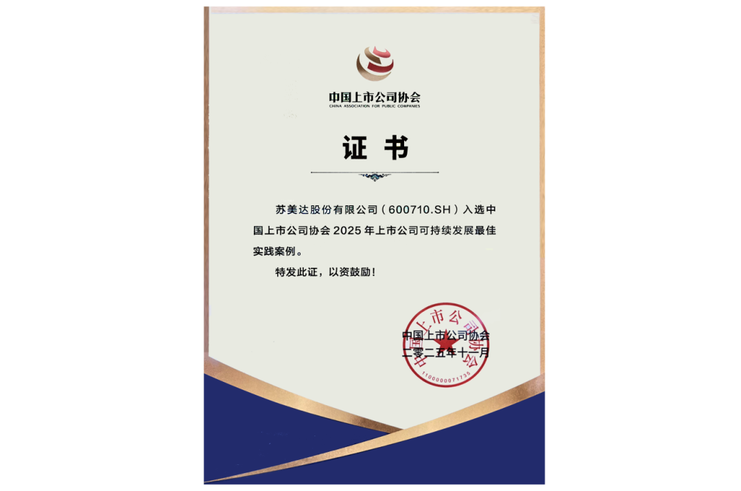 2025年11月18日11月18日,中国上市公司协会(以下简称“中上协”)在北京召开第三届理事会第六次会议暨2025上市公司可持续发展大会。会上,苏美达股份有限公司荣获“2025上市公司可持续发展最佳实践案例”及“2025上市公司董事会优秀实践案例”两项奖项。本次获奖体现了中上协对苏美达践行ESG及可持续发展、董事会规范运作等方面工作的肯定。
