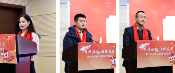 轻纺公司张巧凤、机电公司王涛、成套公司骆翼作为归国员工代表,分享海外工作经历,表示将坚定信心做好海外市场开拓工作。