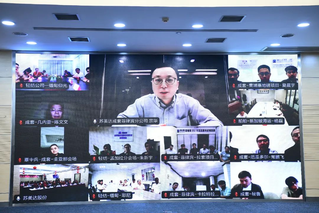 公司领导和参会人员,与驻守海外的苏美达员工进行视频交流,五金公司美洲事业部总经理魏军、船舶公司海运公司负责人杨磊等驻外员工,感谢了公司及同事们的关心,汇报了驻外工作和生活情况,表达了接续奋斗的决心。