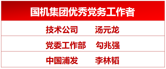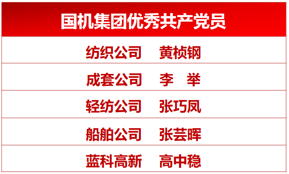 其中,黄桢钢、李举、张巧凤、张芸晖、高中稳荣获国机集团优秀共产党员,汤元龙、勾兆强、李林韬荣获国机集团优秀党务工作者。