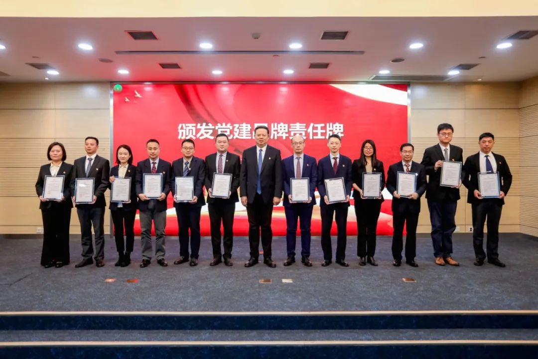 陈峰向各职能部门支部书记颁发党支部党建品牌责任牌。